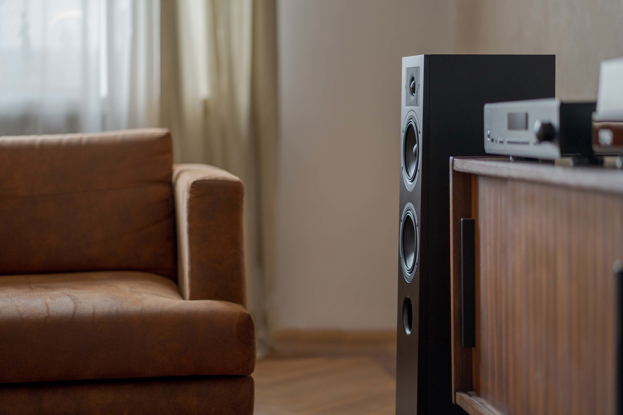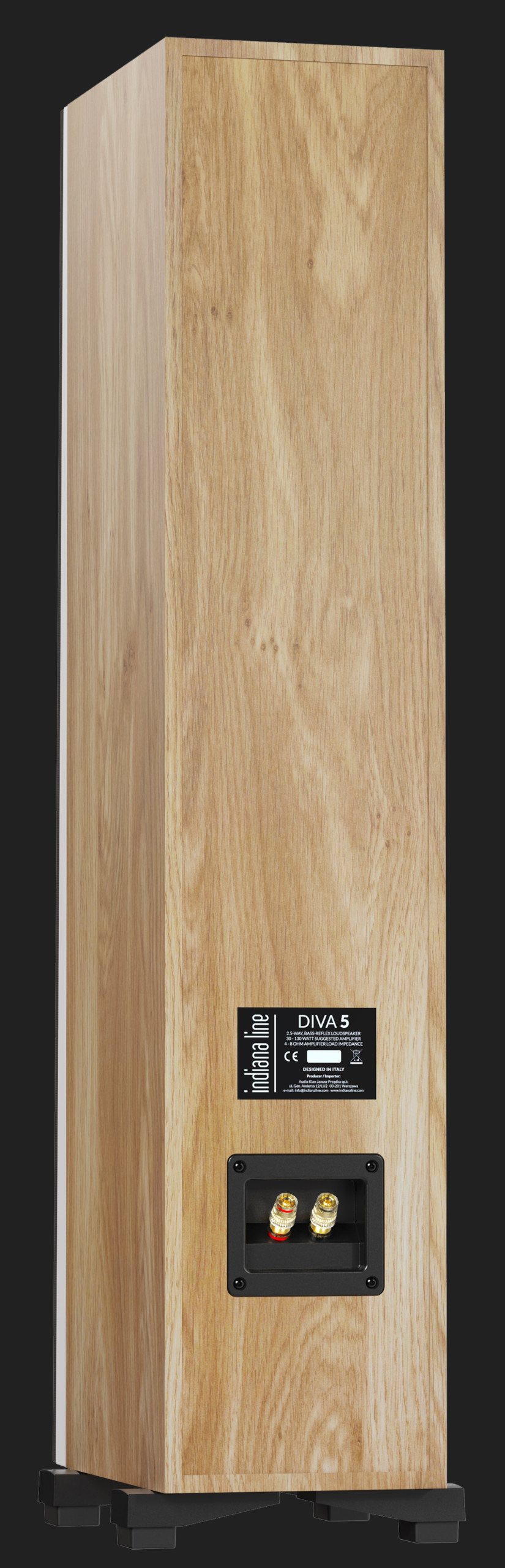 Usor inclinatColoana Diva 5 are un dulap din două piese din MDF. Una dintre părți este panoul frontal de 30 mm grosime, care crește stabilitatea mecanică a carcasei și previne rezonanțe nedorite, îmbunătățind semnificativ claritatea sunetului. Partea frontală este ușor înclinată dând coloanei un aspect nobil, deoarece se sprijină pe picioare solide din aluminiu turnat. Designul atractiv al lui Diva 5 este accentuat de grila transparentă acustic, atașată magnetic, care înlocuiește știfturile de plastic folosite anterior pentru atașarea capacului, așa cum se vede în alte coloane din seria Diva, inclusiv modelul Diva 552.